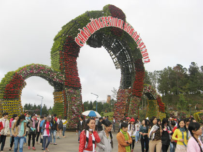 Điểm nhấn nổi bật nhất là không gian hoa trên Đồi Cù do Hiệp hội hoa Đà Lạt thực hiện. Đó không chỉ đơn thuần là những thảm hoa, mà còn là những nét vẽ bằng hoa rất ấn tượng trên sân gofl Đồi Cù.