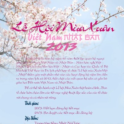 (Cinet)- Vào ngày 20 – 21/4/2013, tại Trung tâm Hội chợ Triển lãm Việt Nam – 148 Giảng Võ, Q. Ba Đình, Hà Nội, sẽ diễn ra Lễ hội Mùa Xuân Việt – Nhật 2013. Chương trình do Hội Giao lưu Văn hóa Việt – Nhật phối hợp với Cục Hợp tác Quốc tế (Bộ VHTTDL) tổ chức.