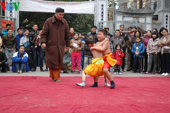 Tiếng trống rộn rã, tiếng hò reo cổ vũ nồng nhiệt… khiến không khí lễ hội vật làng Mai Động (thuộc phường Mai Động, quận Hoàng Mai, Hà Nội) khai mạc chiều 26/1 (tức mồng 4 Tết) vô cùng “nóng”. Cái giá rét cắt da cắt thịt không thể ngăn nổi tinh thần thi đấu quyết liệt của các đô vật, đặc biệt từ phía các đô vật nhí.